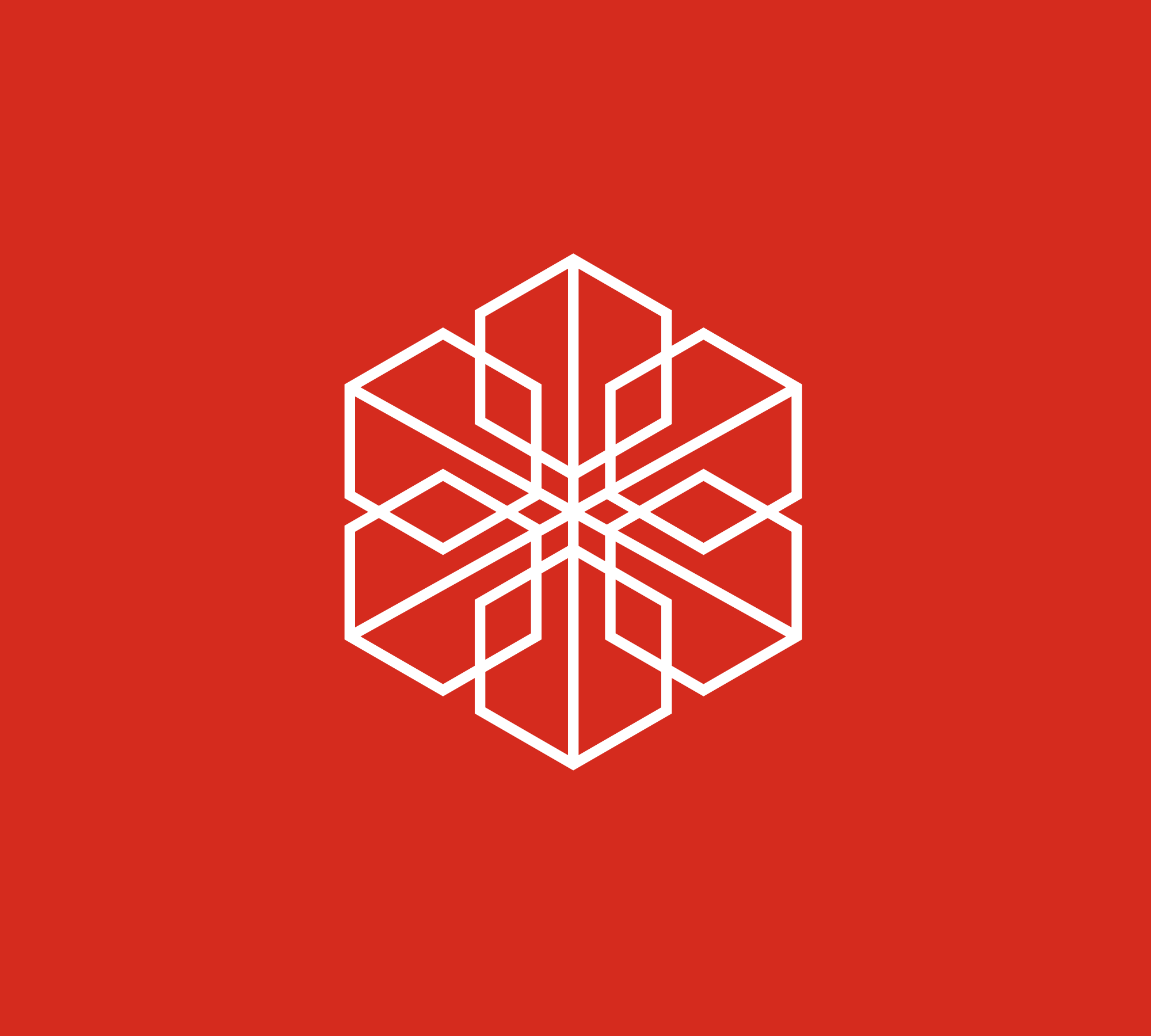 Das Mark selbst ist weiß — auf rotem Grund im Logo, auf dunklem Grund im Dark-Mode. Das Weiß verstärkt die geometrische Präzision des Hexagonal-Marks durch maximalen Kontrast.